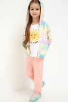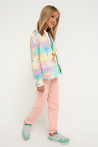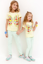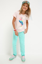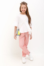 Спортивные трикотажные брюки, на резинке по низу брючин. Пояс на эластичной резинке и кулиске с яркими шнурками. Прорезные карманы по бокам.