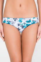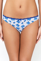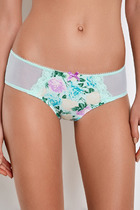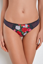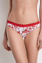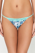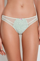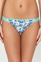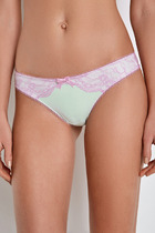 Кружевные трусики-стринги с узким бочком и эластичной отделочной лентой по линии талии. Внутренняя ластовица выполнена из хлопка.