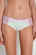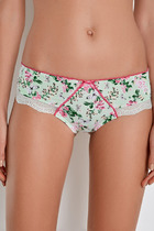 - Яркие трусики-боксер из эластичной ткани и узкого кружева.- Задняя деталь декорирована фигурным вырезом и бантиком.