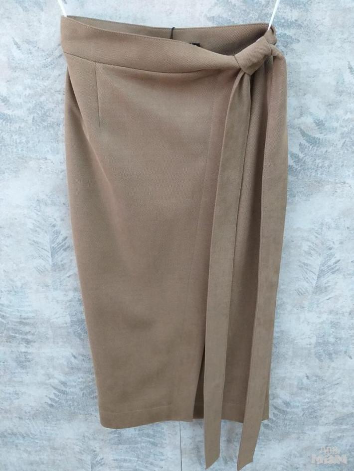 Стильная юбка длиной ниже линии колена из мягкого трикотажного полотна в рубчик“под замшу”.Юбка на запах и завязывается сбоку широким поясом. Подкладка- вискоза 100% дизайнерский прин т