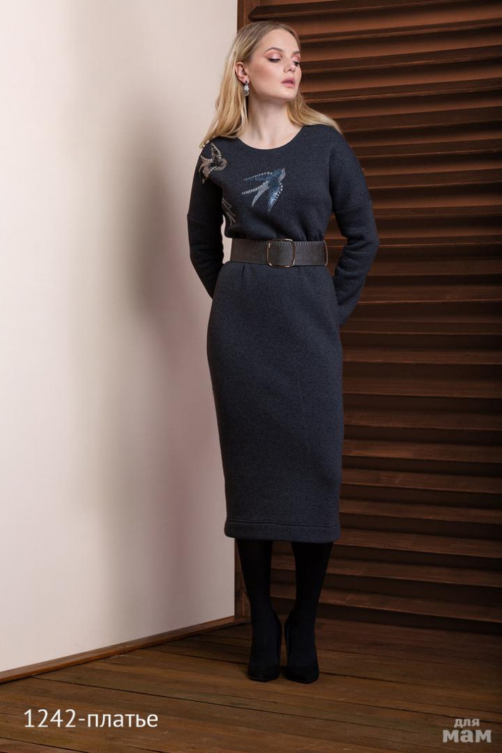 Стильное теплое платье - миди выполнено из плотного трикотажного футера с начесом. Цвет графит. Спущенная линия плеча. Длинный свободный рукав с манжетой - довязом. Горловина круглая. Авторская вышивка “Ласточки”