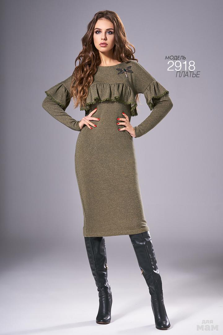 Изящное женское платье полуприлегающего силуэта из трикотажной ткани с мерцающим блеском. Модель со спущенным рукавом и втачными воланами на уровне груди и рукава. По низу волана нежное кружево. Модель дополнена дизайнерской брошью в виде стрекозы.