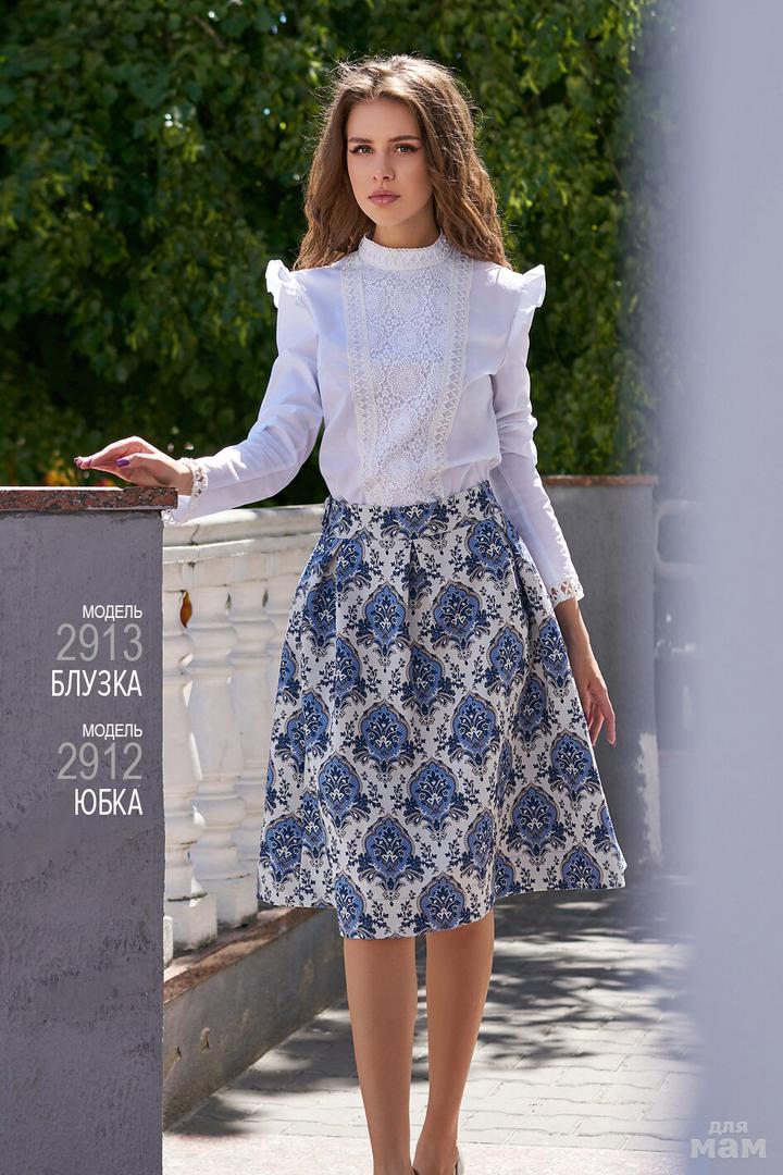 Дизайнерская блузка с воланчиками по рукавам, из хлопковой ткани полуприлегающего силуэта с воротником стойка и застежкой на планку по спинке. Модель по переду воротнику и низу рукавов украшена ажурным кружевом.