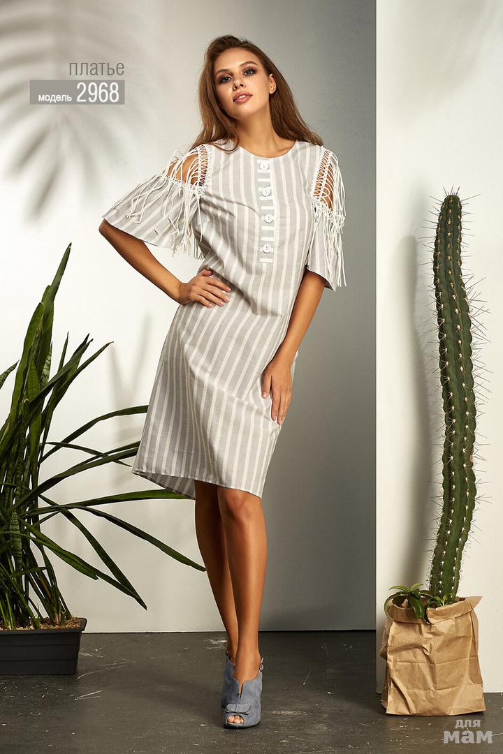 Стильное платье из тонкой хлопковой ткани в выразительную полоску. Модель прямого силуэта, ассиметричной длины. Перед платья с полупланкой, застегивающейся на петли и пуговицы в тон основной ткани. Рукава оформлены в виде воланов открывающих верхнюю часть плеча. Вырезы рукавов и спинка на уровне лопаток декорированы модным хлопковым кружевом с отделкой бахромой.