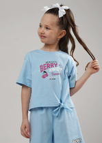 Футболка из трикотажного хлопка в набивку. Украшена жаккардовой нашивкой.— Описание у На сайте поставщика