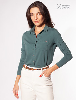 Трикотажная блузка из премиального хлопка. Застежка на планку с золотистыми пуговицами. Спереди один накладной карман. По бокам два разреза с ассиметричной длиной низа. Изделие украшено фирменным логотипом бренда.