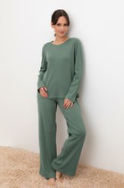 Брюки женские из смесового хлопка с добавлением эластана со съемным поясом и боковыми карманами.