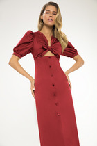 Яркое миди-платье с короткими рукавами. Верх платья очень фактурный благодаря узлу, который завязывается на лифе и пышным рукавам фонарикам.