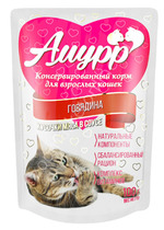 Влажный корм для кошек. Состав: Мясо и субпродукты (говядина не менее 35%), злаки, таурин, минеральные вещества, витамины.