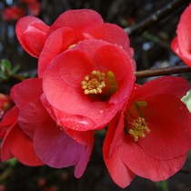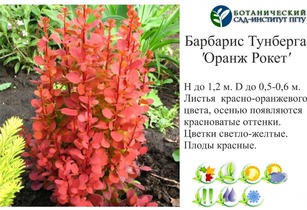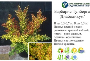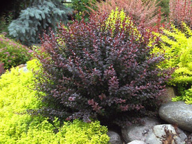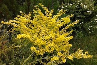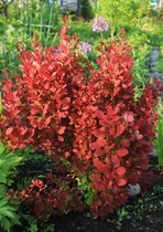 Куст высотой до 0,9м округлый. Листья карминово-красные, осенью багряно-бордовые. Цветы ярко-желтые.