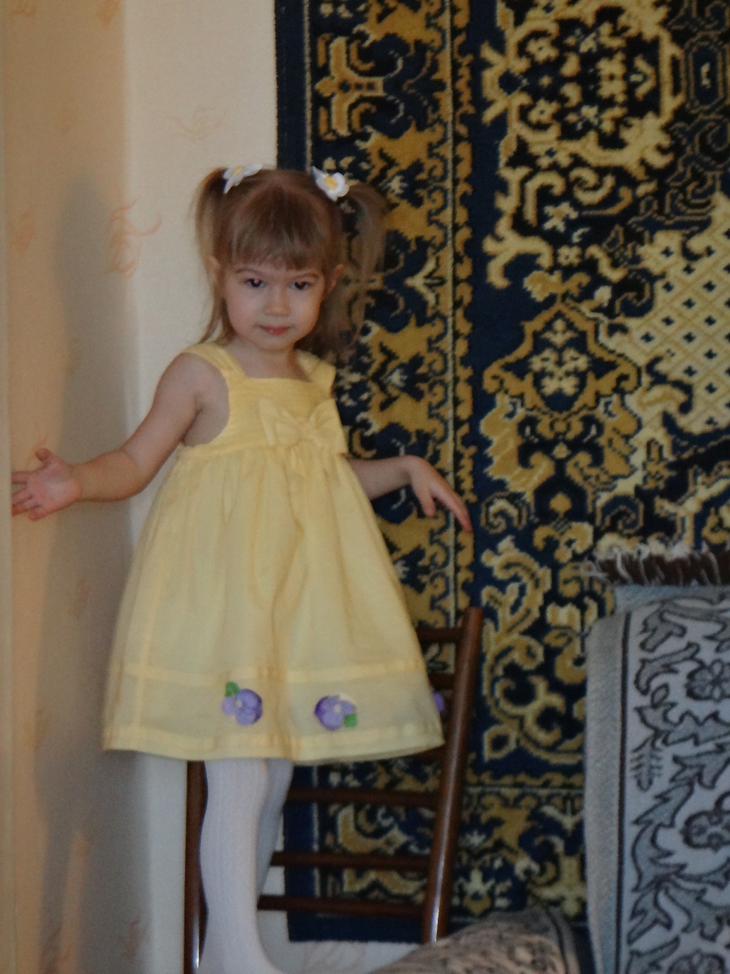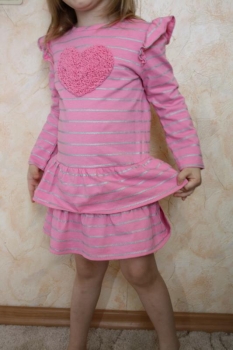 Спасибо, Юличка за замечательную закупку. Платье и штаны CRAZY 8 р.3, у дочки рост 93 см, по фото видно, что чуть-чуть великоваты. Платье 100% хлопок, немного тянется, штаны флисовые, резинка не тугая и у нас сзади немного спадывают, но плавки не видно.