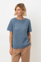 Вязаный джемпер прямого силуэта из поливискозной пряжи. Основное переплетение интерлок. Короткий втачной рукав. По горловине отложной воротник с застежкой на молнию.