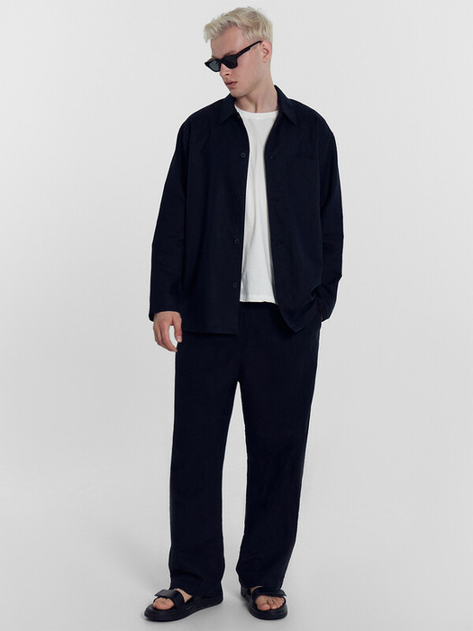 Брюки прямые, посадка средняя. Пояс отрезной с эластичной тесьмой внутри. По переду пробиты петли и втянут шнур-бейка из основного полотна с застроченными концами. В боковых швах обработаны карманы. По переду обработан гульфик с супатной застежкой на петли и пуговицы. На задней правой половинке накладной карман. Нижние срезы брюк обработаны швом вподгибку.