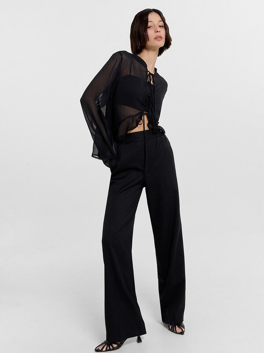 Брюки прямые, свободные. Посадка высокая.Пояс отрезной состоит из двух частей. Задняя часть с эластичной тесьмой внутри. В боковых швах обработаны карманы. На правой передней половинке проложена декоративная строчка - имитация гульфика. На передних и задних половинках заутюжены стрелки. Нижние срезы брюк обработаны швом вподгибку