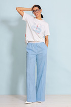 Боковые швы смещены вперед, чтобы создать более плавный и женственный силуэт. На поясе предусмотрена мягкая резинка, а в боковых швах спрятаны удобные карманы. Особый крой в области колена позволяет брюкам сохранять свою форму и не сковывать движения при ходьбе.