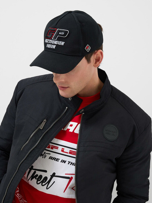 Мужская бейсболка из черного хлопкового текстиля с жестким изогнутым козырьком. На передней части вышит крупный логотип, а сбоку — фирменный силиконовый шеврон. Козырек украшен серым кантом, подчеркивающим форму. Размер можно отрегулировать с помощью металлической пряжки сзади. На верхней части — небольшая пуговица и вентиляционные отверстия.