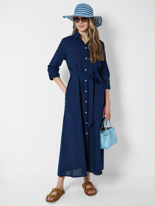 Женское платье в длине макси. Модель выполнена из хлопковой ткани, имеет прямой верх и расширенную к низу юбку, за счёт чего красиво смотрится в движении. Платье застёгивается на пуговицы. Линия талии подчёркивается съёмным поясом. Рукава длинные, с манжетами на пуговицах. По бокам предусмотрены удобные карманы. Воротник классический, отложной.
