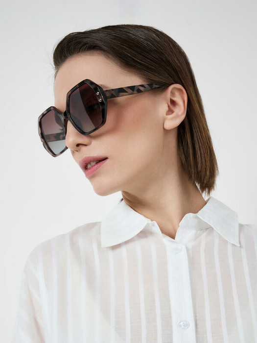 Солнцезащитные очки трендовой крупной формы для женщин. Оправа имеет анималистическую расцветку, линзы коричневого цвета. Солнцезащитные очки с фильтром Cat3 и поляризацией.  Тёмные линзы имеют защиту UV400, которая отражает 100% ультрафиолетовых лучей с длиной волны менее 400 нанометров, эффективно блокируя все ультрафиолетовые лучи при солнечном свете. Высококачественная пластиковая конструкция: легкая, небьющаяся и гибкая. Ширина оправы - 148 мм, длина дужек - 145 мм. Обхват головы 54-56 см. Небьющиеся линзы из триацетата целлюлозы устойчивы к царапинам.  Поляризационные фильтры на очках поглощают блики, отражаемые от горизонтальных поверхностей, что помогает повысить четкость зрения и избежать напряжения глаз. Только при просмотре в линзах с поляризацией видна машина на дороге на тест-картинке, вложенной в чехол.  Небьющиеся линзы из триацетата целлюлозы устойчивы к царапинам. Такие очки эффективны для защиты глаз в тропиках, у моря и в горах. В комплекте: фирменный текстильный чехол из неопрена с магнитной застежкой,брендированная  тряпочка из микрофибры для ухода за изделием, тест-картинка с машиной.  Очки транспортируются в картонной коробке.
