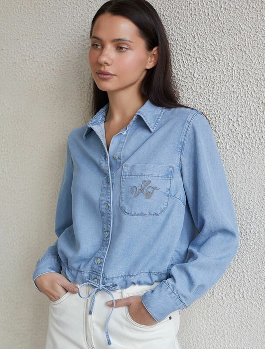 Укороченная стильная блузка светло-синего цвета с кулиской по низу выполнена из мягкого джинсового лиоцелла плотностью 7,8 OZ, который отлично держит форму и обеспечивает комфортную посадку на любую фигуру. Кулиска сформирует красивый силуэт, позволяя легко регулировать длину по желанию и подчеркнет достоинства фигуры, не стесняя движений. Короткая джинсовая рубашка на пуговицах с отложным воротником придаст образу стильный и современный вид. Практичная деталь — карман на груди с аккуратной вышивкой в виде логотипа бренда - украшает изделие. Ткань сочетает прочность и мягкость лиоцелла с вискозой, что делает её невероятно комфортной, дышащей, устойчивой к сминанию и идеально подходящей для чувствительной кожи. Благодаря нежным тактильным ощущениям, будто шелк, от которого ощущается приятная прохлада, рубашка отлично подходит для создания легких летних образов или стильных ансамблей на каждый день засчет своей универсальности. Длинный рукав гарантирует свободу движений и удобство на весь день. Джинсовую блузк