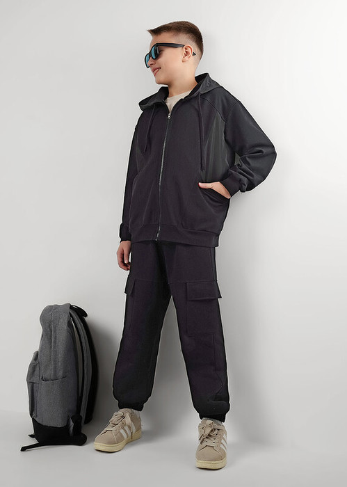 Удобные брюки из мягкого футера для мальчика с декоративными рельефами в области колен. Модель оснащена накладными карманами, эластичным поясом с регулировкой по талии для комфортной посадки.Сочетай брюки с футболками и толстовками из новой коллекции!