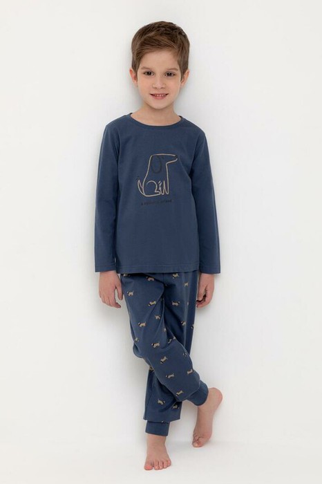 Трикотажная пижама из натурального хлопка. Джемпер с длинными втачными рукавами и брюки с эластичной резинкой в поясе. Мягкие манжеты по низу брюк. Оригинальные набивка и принт выполнены из стойких гипоаллергенных текстильных гипоаллергенных красителей. Изделие сохраняет цвет и форму после многократных стирок. Все трикотажные полотна производятся в соответсвии с нормами швейцарского сертификата ЭкоТекс.