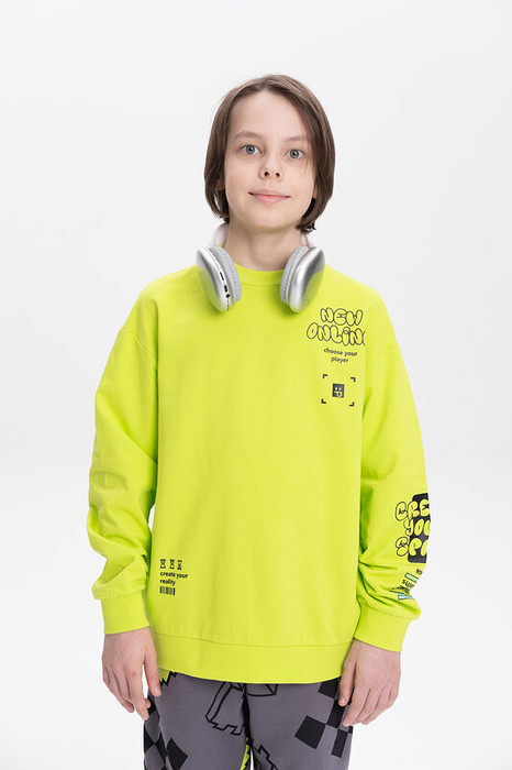 Свитшот без начеса из материала футер-петля. Манжеты и низ изделия из рибаны. По переду принт в виде смайлика, а также текстовый принт. Перевод надписи: "new online" - новый онлайн, "choose your player" - выбери своего игрока, "create your reality" - создай свою реальность. Рукав также украшен принтом с надписью. Перевод надписи "create your space" - создавай свое пространство, "energy, power-ups, coolest-100%" - энергия, бонусы, крутость - 100%. В составе ткани преобладает высококачественый хлопок — спортивная кофта приятна на ощупь и прекрасно пропускает воздух. Тонкую весеннюю кофту можно носить круглый год. Подходит для любителей корейской и японской моды, стиля аниме. Широкая размерная сетка подойдет как для малыша так и для подростка.
