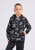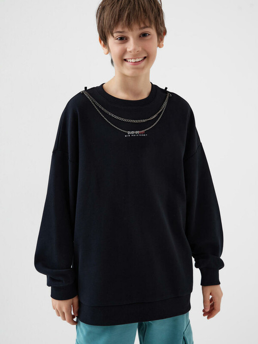 Толстовка трикотажная оверсайз для мальчика подростка. На груди расположен выразительный принт. Особенность дизайна — декоративная металлическая цепочка, которая крепится к горловине с помощью карабинов.  Круглый вырез горловины, нижний край и манжеты выполнены из риба, что обеспечивает комфортную посадку. Свитшот хорошо подойдёт для весенне-летнего сезона.