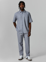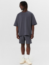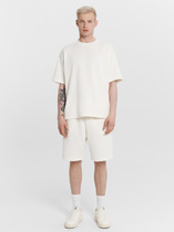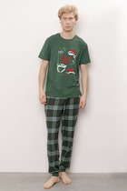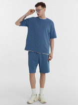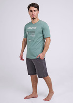 Костюм мужской, состоящий из футболки и брюк. Футболка однотонная с принтом на груди; модель свободная, со спущенной линией плеч, овальным вырезом горловины. Брюки из полотна с набивным рисунком эксклюзивного дизайна, прямые, с боковыми карманами с обтачными входами, на притачном поясе с отстроченной эластичной тесьмой.