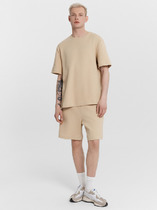 Костюм мужской, состоящий из футболки и брюк. Футболка однотонная с принтом на груди; модель свободная, со спущенной линией плеч. Брюки из полотна с набивным рисунком в узкую черно-белую полоску, прямые, с боковыми карманами с обтачными входами, на притачном поясе с отстроченной эластичной тесьмой.