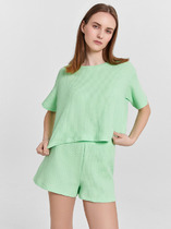 Сорочка молодежная из гладкокрашеного трикотажного вискозного полотна на узких бретелях, полуприталенного силуэта, слегка расширенная книзу. V-образная горловина полочки и спинки отделана кружевными вставками треугольной формы. Проймы окантованы основным материалом.