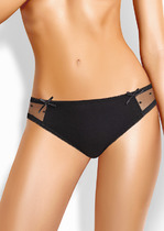 Классическая модель из однотонного трикотажа. На детали переда - симметричные кружевные вставки. По ножкам талии - резинка с фестоном. На детали переда по центру - небольшой атласный бант.