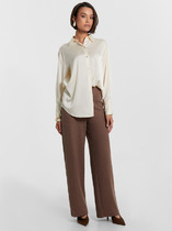 Брюки прямые свободные, посадка средняя. Пояс цельнокроеный с эластичной тесьмой внутри (20мм 20RV). С внутренней стороны пояса пробиты петли и втянут шнур-бейка из основного полотна. На деталях переда обработаны карманы-хулиганы. Подкладка карман из основного полотна. На правой детали переда имитация гульфика. Нижние срезы обработаны швом вподгибку с закрытым срезом.