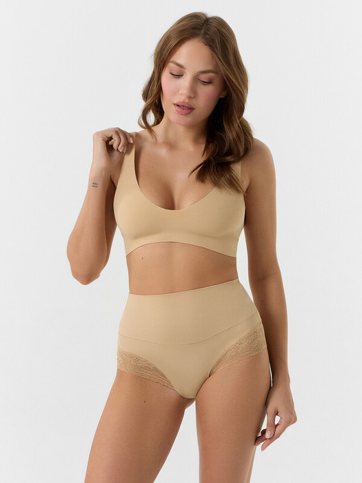 Трусы женские корректирующие с высокой посадкой, из эластичного кружева и трикотажного полотна микрофибры. Верхние детали из микрофибры соединены между собой ширителем, нижние детали из кружева. Верхняя часть двойная, со сгибом по талии. Подкладка ластовицы выполнена из кулирного полотна, отлетная по переднему краю. По срезам ластовицы жилка 6мм. внутри (WT4-6).