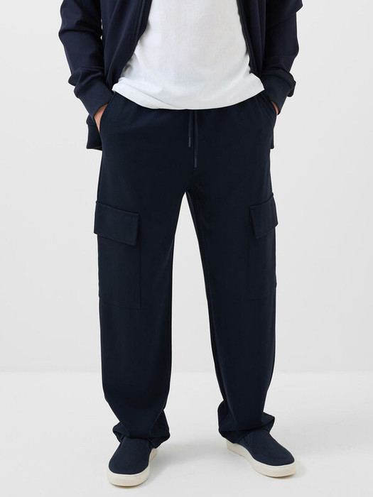 Мужские трикотажные брюки карго. Прямой силуэт, который слегка сужается к низу, и средняя посадка. Пояс на резинке, дополнен утягивающим шнуром. Брюки оснащены двумя боковыми карманами и накладными карманами-карго.
