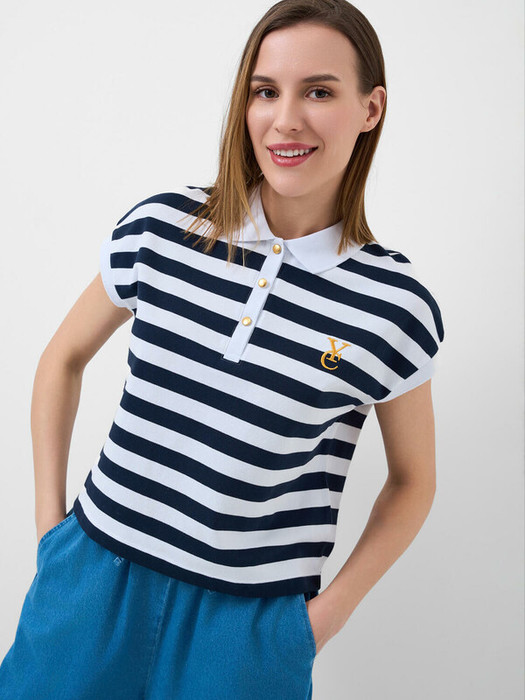 Женская футболка-поло в полоску. Модель прямого кроя, с коротким рукавом, выполненная из хлопкового трикотажа пике. Спереди — застежка на три кнопки.