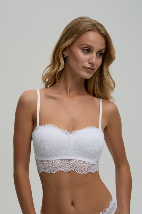 Бюстгальтер с формованными чашками bandeau без push-up во всех размерах, без каркасов и с боковыми корсетными вставками, выполнен из нежного кружевного полотна. По верхнему срезу бочка и спинки силиконовая лента. Бретели регулируемые, съемные. Изделие укаршено широкой кружевной лентой под грудью и брендированной шильдой.