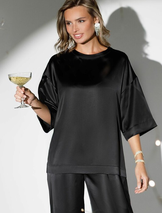 Блузка с короткими руквами черного цвета из струящегося плотного сатина создана для ценительниц комфорта и элегантности. Материал отличается высокой плотностью, что делает блузку устойчивой к износу и сохраняет аккуратный внешний вид даже при длительном использовании. Струящаяся ткань элегантно ложится по фигуре, подчеркивая достоинства силуэта без лишней утяжеленности, в тоже время приятно ощущается на теле.