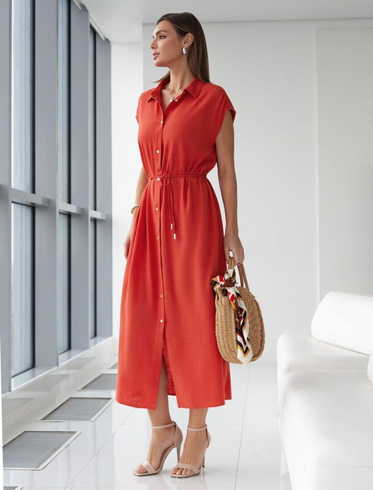 14.04 Vilatte Длинное платье-рубашка с поясом и разрезами изо льна с вискозой D2