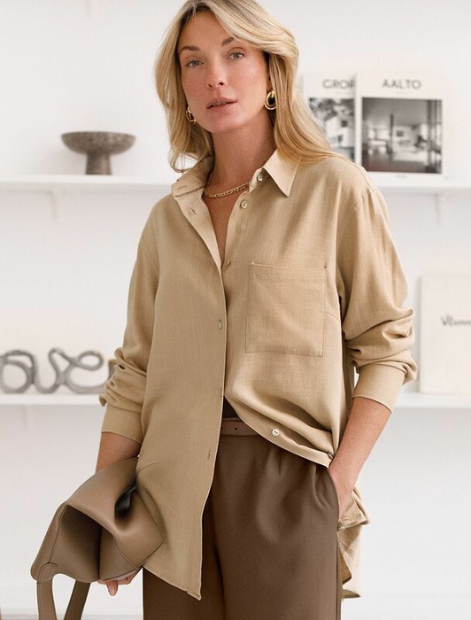 Совместные закупки Екатеринбург Женская одежда Блузки, рубашки — 14.04 Vilatte Свободная удлиненная блузка с карманом изо льна с вискозой D29.357