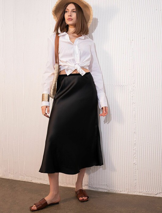 Юбка с разрезом выполнена из плотного полуматового сатина. Модель, скроенная по косой мягко, струится по телу и почти не мнется. Посадка на талии украшена эластичной бархатной лентой. Совет стилиста: сочетайте юбку в костюме вместе с топом D23.057 и блузкой D29.796 чтобы создать роскошный праздничный образ, или используйте как яркий акцент в базовом гардеробе, в тренде с вязаным верхом, жакетом over-size и футболками.