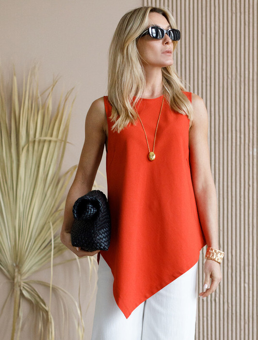 Топ выполнен из плотного лиоцелла. Удлиненная модель с трендовым ассиметричным низом. Ткань изделия отлично держит форму, плавно драпируется и не просвечивает. В теплое время года приятно охлаждает кожу. Добавление синтетических волокон в составе изделия, предотвращает сминаемостьи поддерживает формоустойчивость. Топ сочетается в костюме с брюками D24.261, D24.265, D24.267, юбкой D24.261, шортами D28.057, а также очень эффектно с белыми шортами и джинсами.
