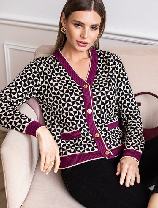 Жакет с V-вырезом в стиле «Шанель» жаккардовой вязки выполнен из нежной пряжи на основе вискозы с добавлением кашемира. Мягкая модель с золотистой фурнитурой не раздражает кожу, приятно ощущается на теле и поддерживает комфортный микроклимат. Совет стилиста: сочетайте с однотонными брюками, юбкой, платьем или джинсами. Можно в комплекте total-look с D39.310 и с платьем D32.073