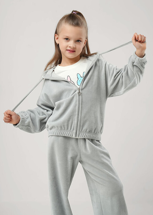 Уютная толстовка из мягкого велюра для девочки. Модель с застёжкой-молнией, свободным силуэтом и удобным капюшоном. Длинные рукава и карманы-кенгуру. Приятный на ощупь материал создаёт комфорт и сохраняет тепло.