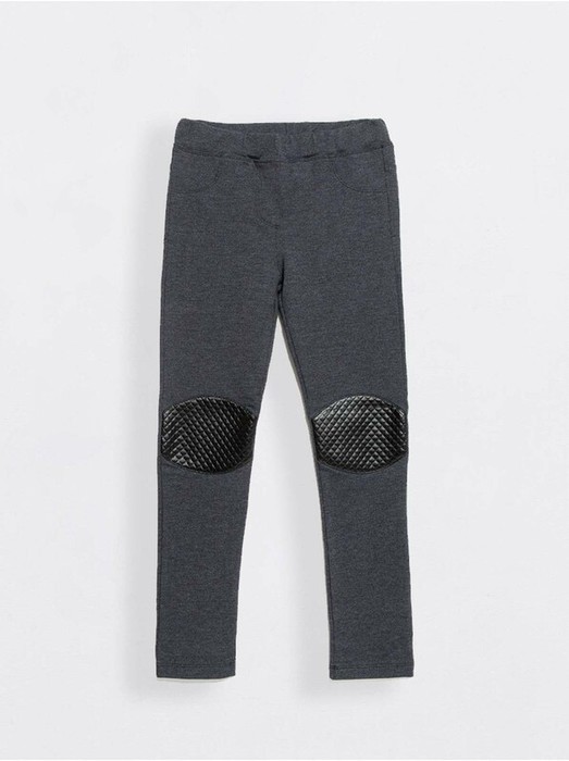 Леггинсы для девочки из трикотажного полотна "футер", с боковыми швами. По задним половинкам-кокетки и накладные карманы из отделочного полотна "кожа". По передним половинкам изделия-имитация гульфика и боковых карманов, в области колена-декоративные наколенники из отделочного полотна "кожа". Верхний срез изделия обработан притачным поясом с резинкой внутри. По швам притачивания кокеток передних и задних половинок, по верхнему участку боковых швов, шву сиденья задних половинок, среднему шву и шву имитации застежки-гульфика передних половинок проложена двойная отделочная строчка с узкой расстановкой игл.