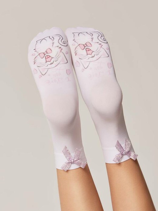 Плотные носки LOVE – отличный подарок для маленькой модницы. Милый рисунок и декоративный бантик добавят образу девочки изюминку. · 50 Den· плотные и эластичные· милый печатный рисунок· пришивной декоративный бантик· с бортом· без пятки.