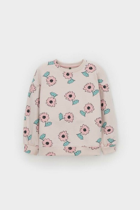Свитшот для девочки из высококачественного петельчатого футера. Обтачка горловины, манжеты и пояс выполнены из эластичного полотна. Для удобства одевания на плече в размере 98 есть застежка на кнопки. Оригинальная набивка выполнена из стойких текстильных гипоаллергенных красителей.
