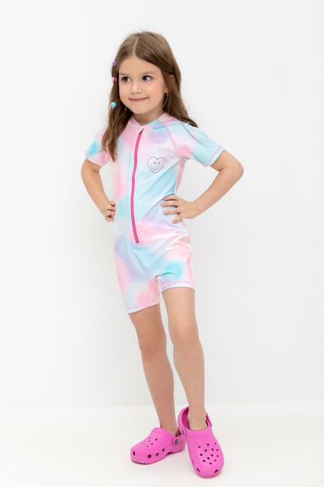 Купальник для девочки. Застегивается спереди на замок. На замке предусмотрена защита для подбородка. На груди и спинке принт. Оригинальный принт выполнен из стойких гипоаллергенных красителей.