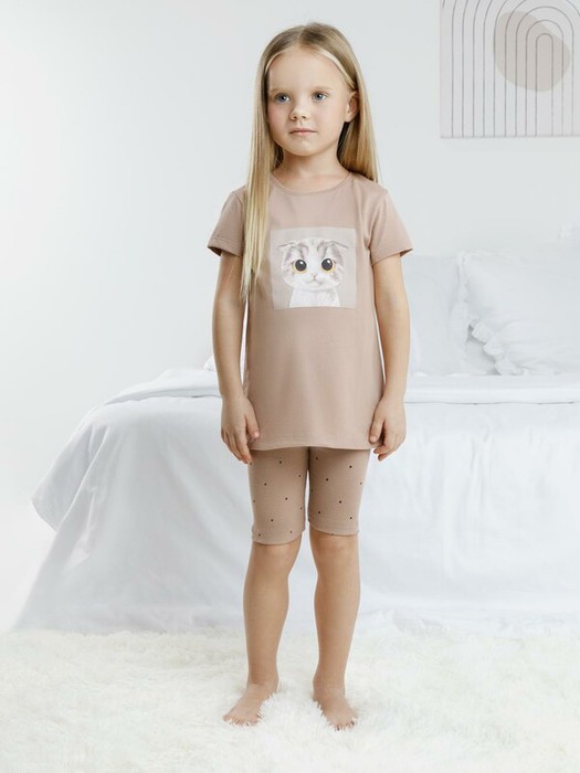 Трикотажная пижама для девочки с футболкой и велосипедками. Удлинённая футболка изготовлена из гладкого трикотажа супрем. Велосипедки выполнены из эластичного трикотажа в рубчик. Оригинальная набивка и принт выполнены из стойких текстильных гипоаллергенных красителей. Изделие сохраняет цвет и форму после многократных стирок. Все трикотажные полотна производятся в соответсвии с нормами швейцарского сертификата ЭкоТекс.
