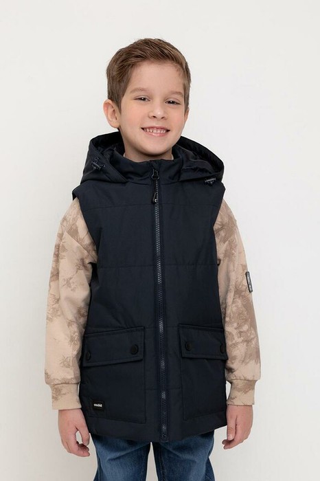 Стеганый жилет с капюшоном для мальчика с утеплителем Fellex®: 120 г/м2. Выполнен из мембранной ткани с дополнительной тефлоновой обработкой. Данный вид обработки предохраняет изделие от загрязнения и лучше отводит влагу. Подклад из 100% полиэстра. У изделия предусмотрена защита подбородка. Капюшон утягивается при помощи эластичного шнура со стопперами. Накладные карманы с клапанами на кнопках. Во всех изделиях верхнего ассортимента для безопасности ребенка предусмотрены светоотражающие элементы.