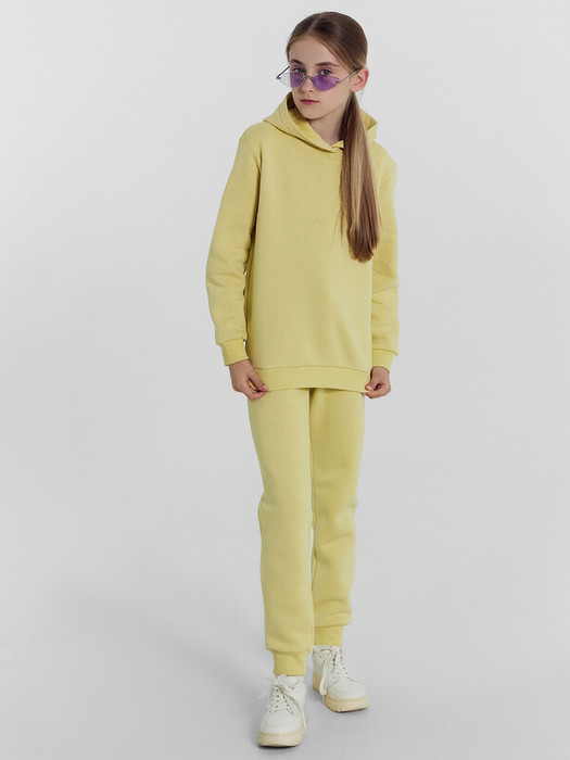 Комплект для самых модных девочек. Выполнен из трикотажного футера без подчеса. Анорак свободного силуэта с капюшоном, спущенной линией плеча, манжетами и поясом из рибаны. Брюки прямого силуэта, с резинкой и регулировочным шнурком в поясе, на манжетах. Уютный комплект!